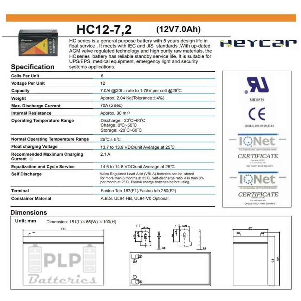 Batería Plomo de la marca Heycar 12V 7.0Ah AGM sellada.